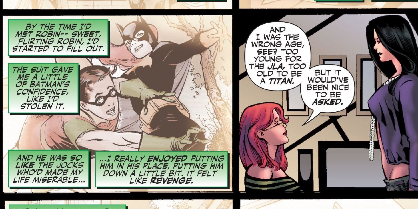 “/> Admitir que su relación coqueta con Nightwing cuando él todavía era Robin comenzó como genuinamente antagónica en 2005. Aves de presa #84, esta aversión inicial se revela durante un momento particularmente vulnerable que Babs tiene con Helena Bertinelli, también conocida como Huntress, mientras recuerda los problemas pasados derivados de sus inseguridades. Al decir que Dick era “… tan parecido a los deportistas que me habían hecho la vida imposible”, Barbara continúa revelando: “Realmente disfruté poniéndolo en su lugar, menospreciándolo un poco”, y termina con una confesión. : “Se sintió como una venganza”.