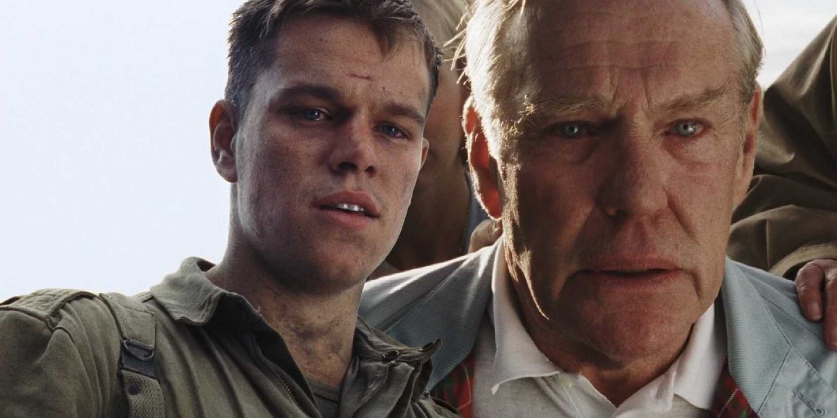 El Matt Damon Salvando al soldado Ryan El discurso puede haber sido discordante para algunos espectadores, pero el hecho de que el Capitán Miller de Tom Hanks parezca compartir los sentimientos de la audiencia hace que la escena funcione notablemente bien. Hay muchas posibilidades de que la reacción incómoda de Tom Hank ante las líneas improvisadas de Damon se deba a que el actor no está realmente impresionado con la historia inventada de su colega, pero su actitud incómoda hace que el discurso de James parezca más consistente y acorde con su personaje.