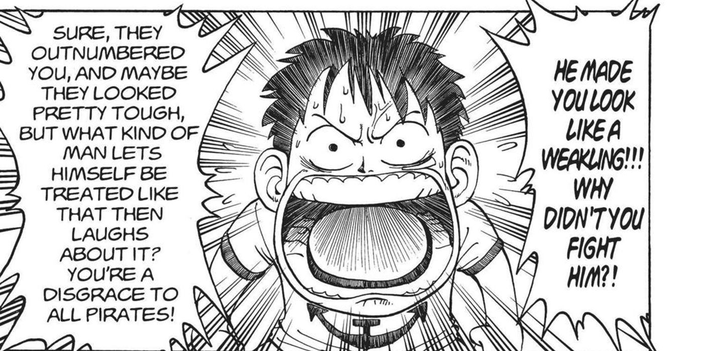 Si bien la frase “sé un hombre” no aparece directamente en ninguna parte de la serie, Una piezaLa noción que tiene de virilidad es evidente ya en el capítulo 1. Cuando Shanks es humillado por el bandido de la montaña Higuma y no dice una palabra, Luffy, que es bastante joven en ese momento, no parece entender por qué Shanks se quedaría en silencio. Luffy reprende a Shanks por no defender su honor, preguntándole “qué clase de hombre” se permite ser tratado como un debilucho y simplemente se ríe.