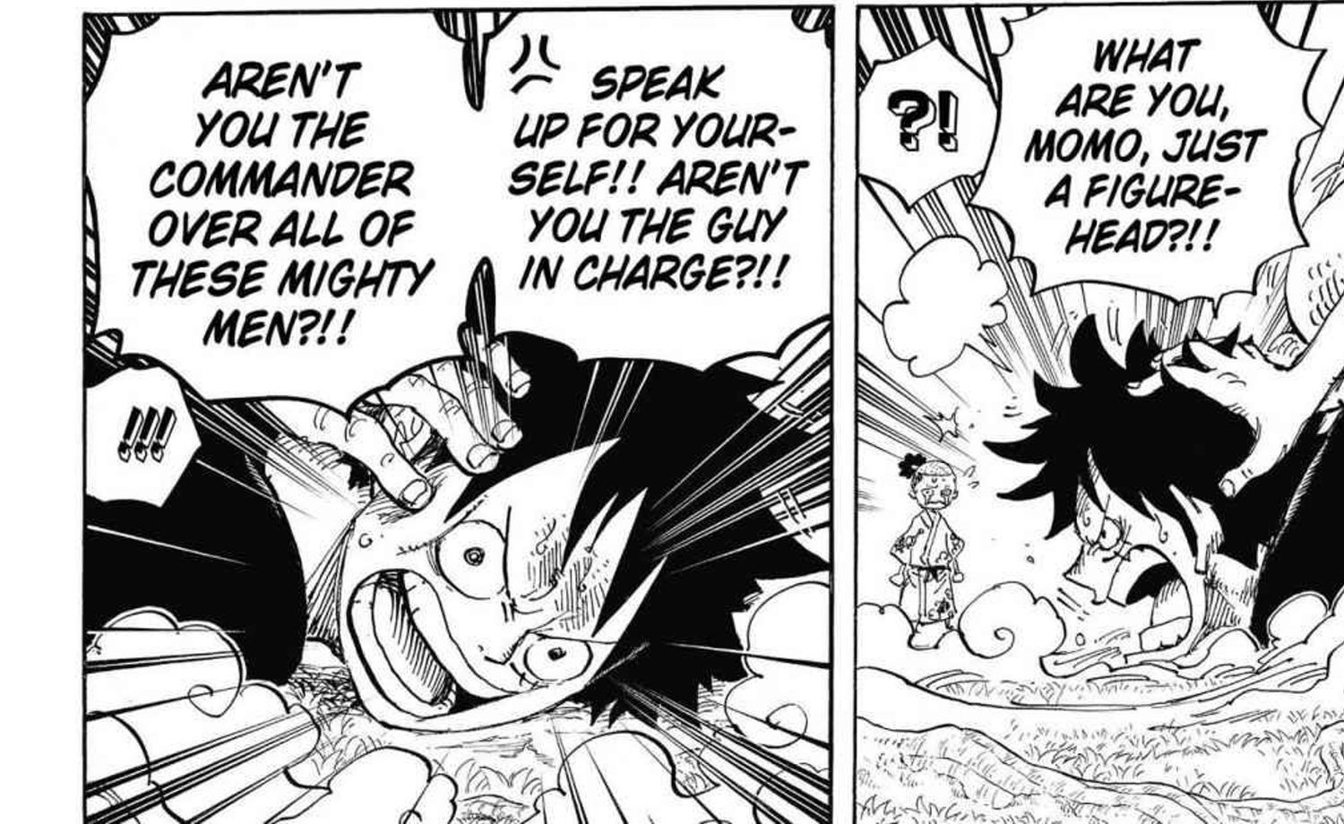 En particular, en el capítulo 819, Luffy reprende a Momonosuke por simplemente sentarse en silencio mientras los samuráis Akazaya piden ayuda. Si bien Luffy no le dice directamente a Momonosuke que “sea un hombre”, ciertamente está casi implícito. Sin embargo, Luffy no avergüenza a Momo por tener miedo o llorar pero pidiéndole a Momonosuke que dé un paso al frente y se haga cargo de la misión de salvar a su país como el código samurái esperaría que lo hiciera.