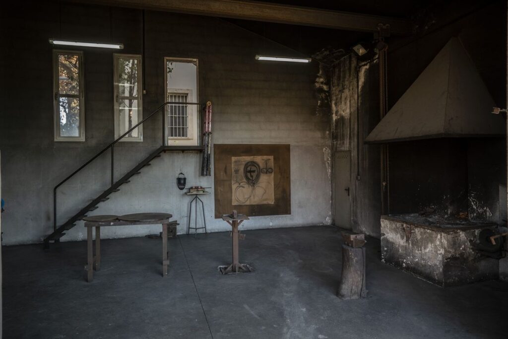 Fuera de la residencia principal, hay una segunda pequeña vivienda, que ocupaba el pintor canario Rafael Monagas, colaborador de Chirino durante muchos años. Desde esa construcción se accede al auténtico enclave de la finca. El artista defendía que lo básico de su taller era una fragua y una ventana. Lo primero que sorprende al visitante son las bellas vistas a los viñedos de una propiedad vecina. Dentro, se ve un yunque con cicatrices de haber soportado el peso del hierro y del martillo durante muchos años. Ya no hay restos de la actividad de la fragua. Ni siquiera se ven los guantes o los delantales abrasados por el fuego. Lo que hay en un espacio contiguo es el resultado de la incesante actividad del cofundador del grupo El Paso. Una veintena de piezas de medio formato recogen su obsesión por el viento y, sobre todo, por la espiral, el motivo mundialmente reconocido en la obra del artista.