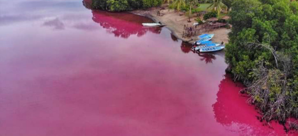 Juchitán, Oax.- La Laguna Manialtepec, ubicada en la localidad de San Pedro Mixtepec región de la costa oaxaqueña y reconocida por sus bioluminiscencias azules debido a la presencia de microorganismos marinos como son varias especies de dinoflagelados, amaneció desde el pasado sábado con un cambio de color “excepcional”… rosa.