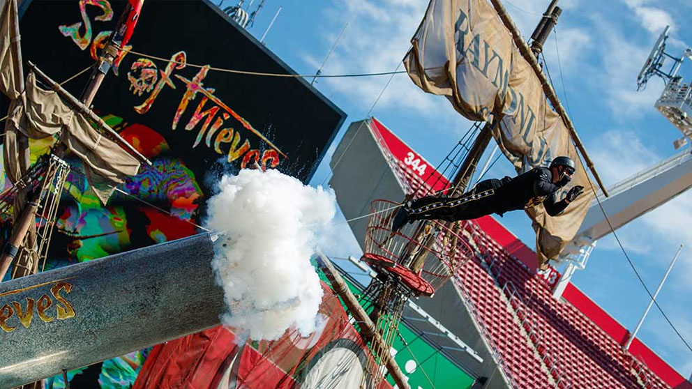 Podemos decir que a día de hoy lo hemos visto prácticamente todo, pero todavía hay cosas que nos sorprenden. Hazañas asombrosas y alucinantes que nos dejan con la boca abierta y, de paso, otorgan a sus protagonistas algún que otro récord Guinness. Uno de los últimos en lograrse tiene que ver con un videojuego de piratas llamado Sea of Thieves que llegará la semana que viene para Xbox One y PC. Dentro de la campaña de promoción por su lanzamiento, Microsoft se alió con David «The Bullet» Smith para intentar un récord Guinness ‘muy pirata’.