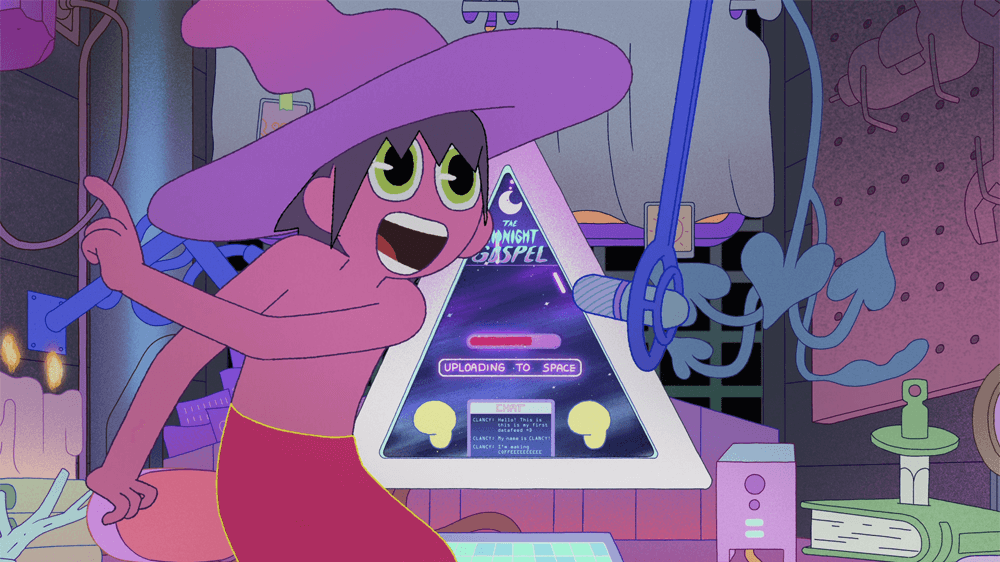 Este es un lugar donde los agricultores de simulación usan potentes biocomputadoras para simular universos donde cosechan tecnología. Debido a que Clancy no está cuidando su simulador de universo, todos los planetas dentro de él están pasando por su propio apocalipsis único, y los seres que viven en estos otros mundos son los invitados que Clancy entrevista para su Space-Cast The Midnight Gospel. A lo largo de la serie, estas conversaciones lentamente comienzan a despertar a Clancy a la realidad del impacto que está teniendo en los mundos, tanto dentro como fuera de su simulador “.