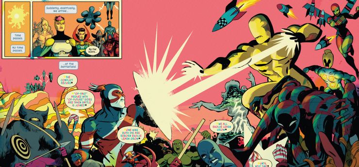 La historia es increíblemente meta, mostrando que los conflictos épicos entre Iron Man y el Capitán América son cruciales para el desarrollo de la comunidad de superhéroes. El Capitán América representa lo mejor de la humanidad a través de la lente de la tradición, del pasado, de ahí su nombre “Of-Past” aquí. Iron Man, por otro lado, representa lo mejor de la humanidad al mostrarnos lo que se puede lograr a través de la ciencia y la tecnología; Iron Man muestra a los lectores el futuro, de ahí su nombre aquí también. Siempre que los dos entran en conflicto, casi siempre comienza por motivos ideológicos, a saber Guerra civil. Cloud muestra a Of-Past y Of-Future una forma en que pueden trabajar juntos y, como resultado, pueden defender su mundo de las fuerzas que buscan destruirlo. Cuando Iron Man y el Capitán América se unen y pueden encontrarse a mitad de camino, pueden suceder grandes cosas.