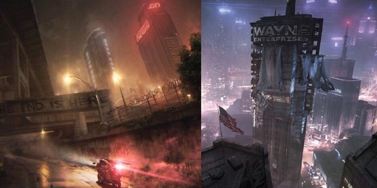 Gotham City nunca ha sido un destino deseable. Su alta tasa de criminalidad, supervillanos desenfrenados, fuerza policial corrupta y la falta de viviendas de calidad obligan a muchos ciudadanos a la miseria y hacen que muchos más se vayan. Frases premonitorias como “El fin está aquí” y la torre rota de Wayne Enterprises tienen implicaciones amenazantes para Batman’s City. Wayne Enterprises apareció con frecuencia como el orgullo y la alegría de Gotham City a lo largo de anteriores Batman Arkham juegos. La fortuna de Bruce Wayne financió no solo su carrera en la lucha contra el crimen, sino que trabajó constantemente para mejorar Gotham y sus ciudadanos. Con la destitución de Bruce Wayne como Batman, los precios de las acciones probablemente se habrían desplomado y resultaron en la muerte abrupta de la compañía. El edificio parece estar totalmente condenado, con la arquitectura fracturada y la construcción a medio terminar abandonada. Además, las letras apagadas en el letrero de Wayne Enterprises confirman el final de la era de Bruce como protector de Gotham dentro y fuera del Batsuit.
