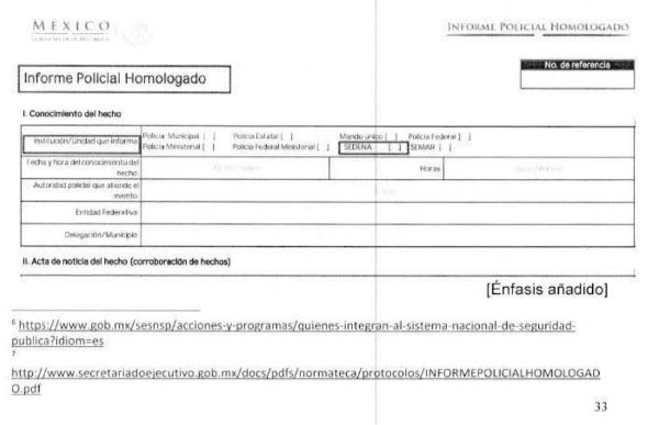 Incluso, como resultado de una búsqueda en internet, la ponencia encontró el formato de llenado el Informe Policial Homologado que incluye un campo denominado “Institución/Unidad que informa” y entre cuyas opciones se encuentra la de “Sedena”.
