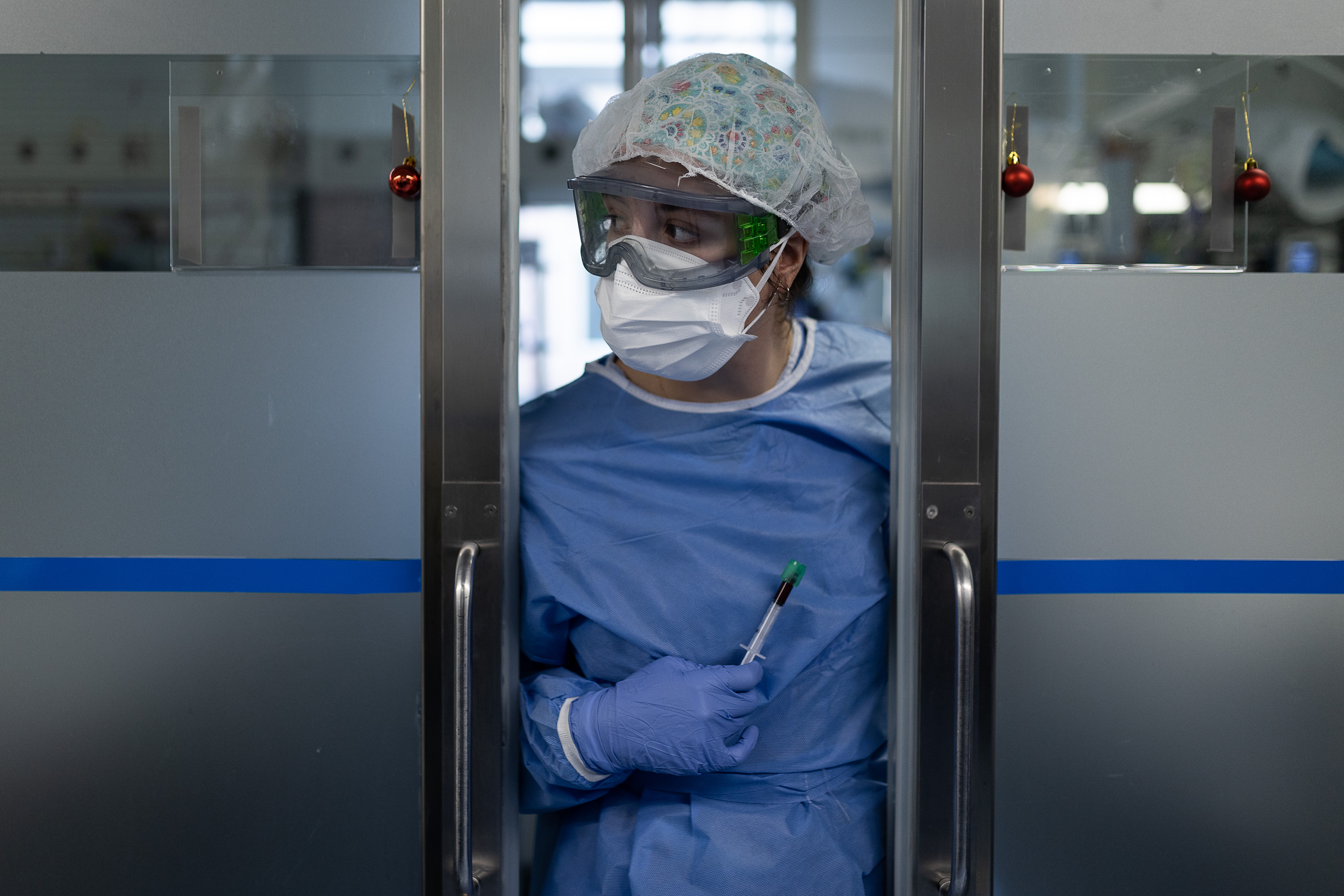 Un corrillo de sanitarios se junta alrededor del punto de control y charlan de la medicación de un paciente o de quién va a dónde. Sobre el mostrador, asoma un pequeño pesebre improvisado entre papeles. Es Navidad. En la pared, una decena de pantallas ilustran las constantes vitales de los pacientes aislados en los boxes. Es la covid.