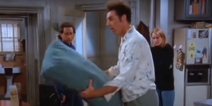Después de hacer su histérico deslizamiento característico, Kramer pronuncia “Oye” antes de tropezar con el sofá, agarrar un almohadón grande y simplemente refunfuñar “sí” antes de regresar a su apartamento con el almohadón a cuestas. Si la novia de Jerry pensó que George era raro, ¿qué piensa de Kramer después de una vista tan aleatoria?