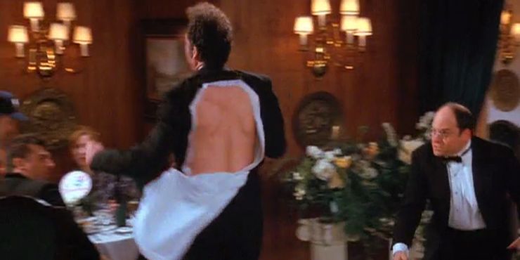 Las deslumbrantes entradas de Kramer se hicieron tan notorias en el programa que Larry David comenzó a encontrar formas para que el personaje ingresara a otros lugares además del apartamento de Jerry. El mejor ejemplo de esto se produjo en la temporada 8 cuando Kramer hizo una gran pirueta de salón de baile después de que le arrancaran la parte trasera de su esmoquin. El crédito parcial es para George por la ayuda.