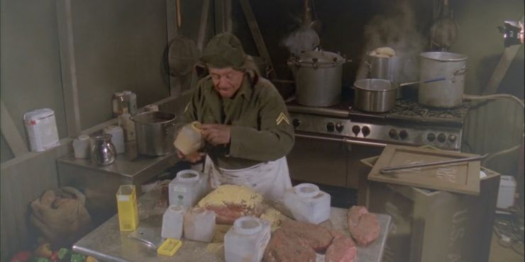 En “The Fatigues” de la temporada 8, el flashback de cocina de Frank Costanza lleva a los espectadores a sus días lanzando hachís para el Fighting 103rd en Inchon, Corea. Recuerda la carne de res de primera calidad de Texas de una manera que hace que los fanáticos deseen que haya cocinado más en el programa. Frank le cuenta a Kramer que él y sus soldados localizaron una caja cargada con 600 libras de buey de Texas.