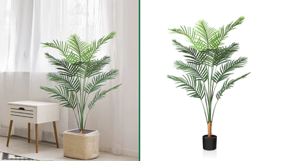 Confeccionada en poliéster, esta planta artificial está cuidadosamente elaborada para obtener una apariencia de palmera real. Mide aproximadamente 120 centímetros de alto, la base está hecho de cemento para evitar que se caiga, y el material resulta fácil de limpiar. El tronco y las ramas incluyen alambres metálicos internos para poder ajustarlos al gusto. Es un producto con una valoración muy positiva en Amazon: 4,5 estrellas sobre 5.
