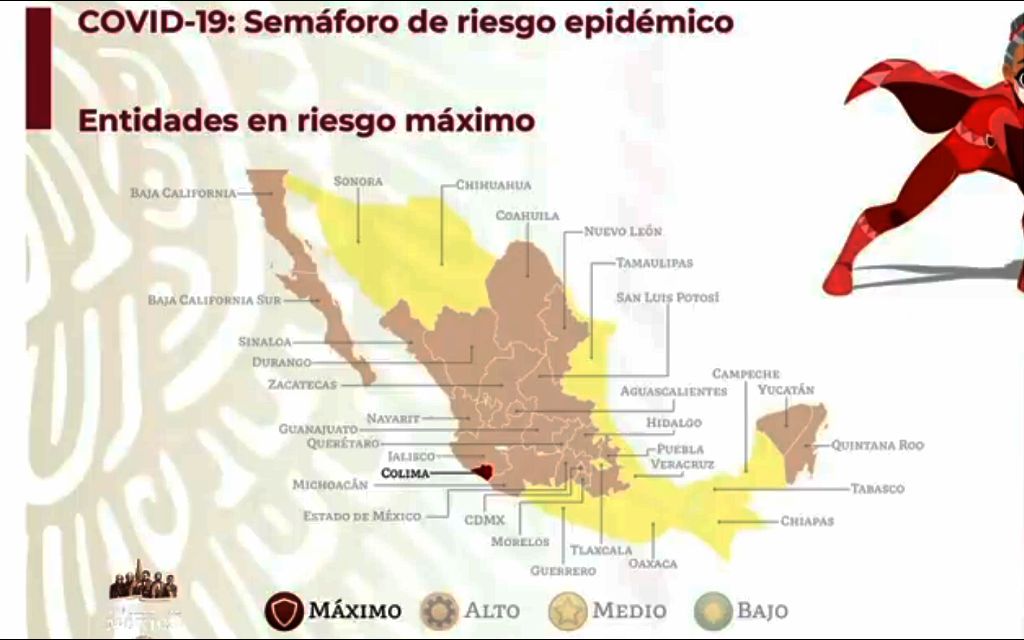 Durante la conferencia vespertina de prensa en Palacio Nacional, el director general de Promoción de la Salud, Ricardo Cortés, informó que el estado de Colima aún se ubica en el color rojo del semáforo, lo cual significa que existe un riesgo máximo de contagio de Covid-19.