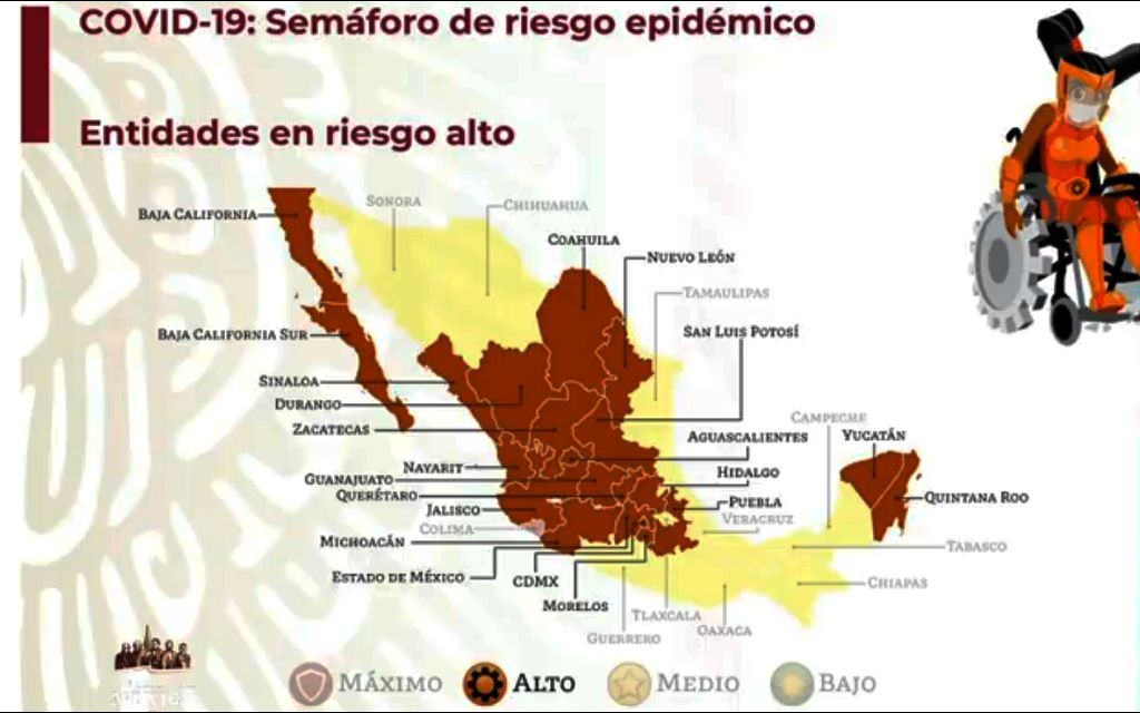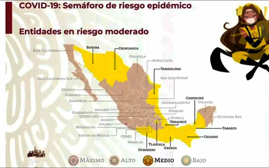 Dos tercios de las entidades federativas (21) aún están en color naranja que representa un riesgo de contagio alto.