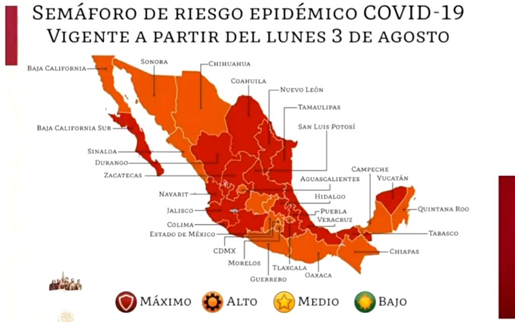 La mitad de las entidades del país ya bajaron a semáforo anaranjado, mientras que la otra mitad continúa en el color rojo de alerta máxima, de acuerdo con el semáforo de riesgo epidémico Covid-19, que estará vigente a nivel nacional a partir del próximo lunes 3 de agosto.