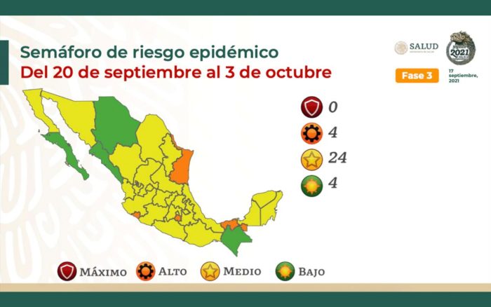 Son cuatro los estados que se ubican en naranja, de riesgo alto de contagio. Son 24 las entidades que presentan un riesgo medio, por lo que se les asignó el color amarillo, mientras que Baja California Sur, Chihuahua, Chiapas y Sinaloa están en color verde, que indica bajo riesgo de contagio.