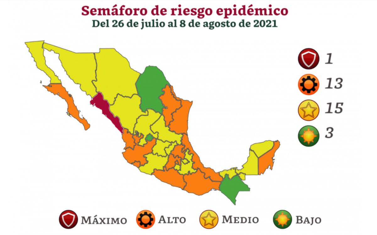 13 entidades del país se ubican en color naranja, que indica riesgo alto de contagio del virus, mientras que 15 están en amarillo de riesgo medio en el semáforo que entrará en vigencia el próximo lunes 26 de julio y hasta el 8 de agosto.