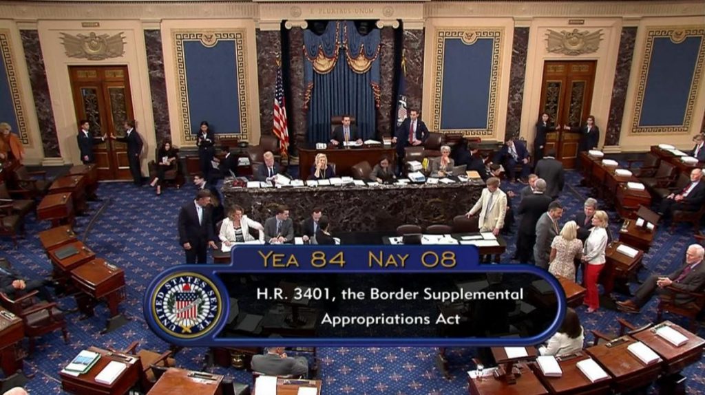 La votación en el Senado se produce menos de 24 horas después de que la Cámara de Representantes aprobó un paquete de ayuda de emergencia de 4,500 millones de dólares para miles de familias migrantes y niños no acompañados detenidos tras cruzar la frontera desde México. La aprobación requirió cambios de último minuto e intensas presiones de los líderes demócratas.