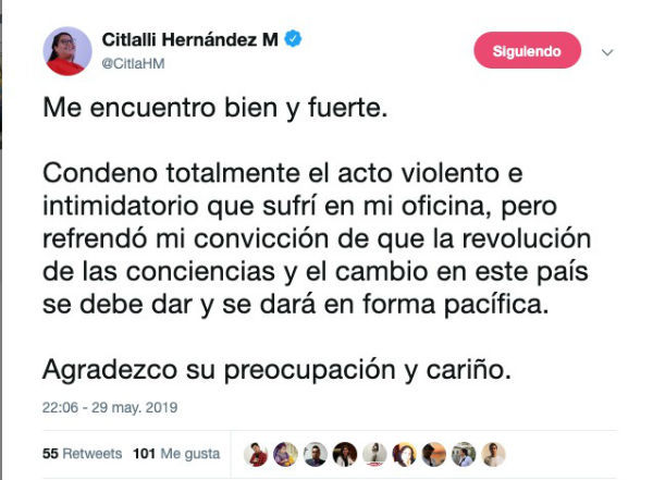 Citlalli Hernández confirmó el hecho y aclaró vía Twitter que se encuentra “bien y fuerte”. “Condeno totalmente el acto violento que sufrí en mi oficina, pero refrendo mi convicción de que la revolución de las conciencias y el cambio en este país se debe dar y se dará de forma pacífica”, añadió.