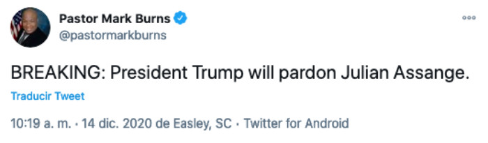 En un mensaje de Twitter, el pastor Mark Burns aseguró que el presidente perdonaría al fundador de WikiLeaks, pero momentos después se desdijo.