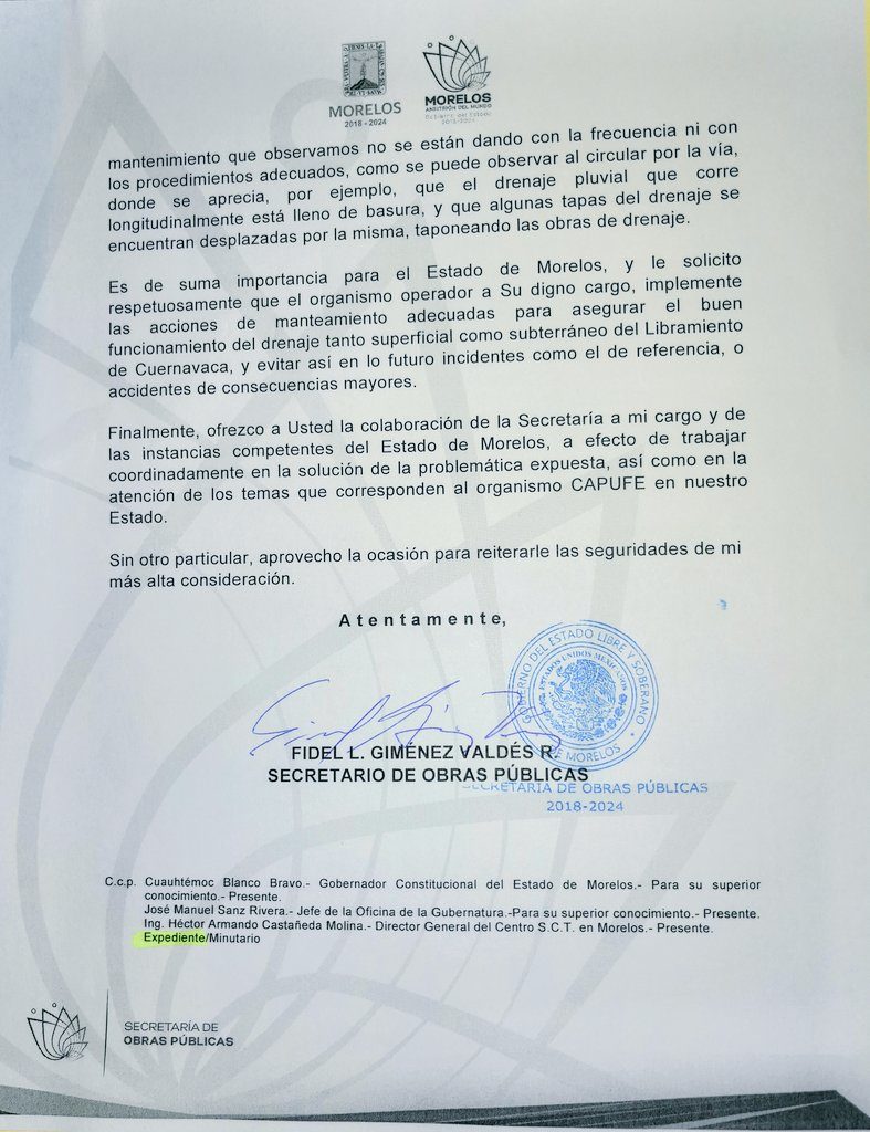 “Es de suma importancia para el Estado de Morelos, y le solicito respetuosamente que el organismo a su digno cargo, implemente las acciones de mantenimiento adecuadas para segurar el buen funcionamiento del drenaje, tanto superficial, como subterráneo del Libramiento de Cuernavaca y evitar así en lo futuro incidentes como el de referencia, o accidentes con consecuencias mayores”, reza el documento.