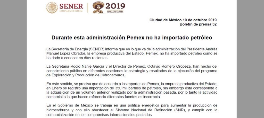 El comunicado publicado el pasado jueves 10 de octubre por la Sener omite reportar la importación efectuada en julio, y solamente refiere a la adquisición realizada por la administración pasada,e, incluso afirma: “por lo tanto la actividad comercial a la que hacen referencia diferentes fuentes es incorrecta”.
