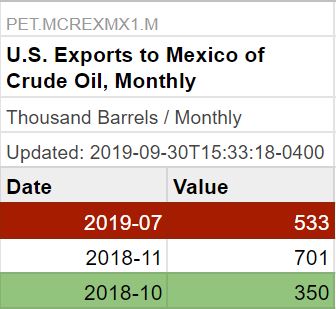 La EAI también registra en su base de datos la exportación hacia México de 350 mil barriles referida por la Sener en su comunicado, y la ubica en el mes de octubre de 2018.