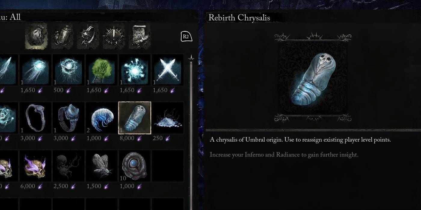 Para respetar a tu personaje, debes intercambiar una crisálida de renacimiento con Pieta para cada estadística que desees restablecer a 0. Rebirth Chrysalis son elementos especiales que rara vez se encuentran en el mundo, solo en dos ubicaciones separadas. Afortunadamente, también puedes compra esta crisálida de dos proveedores separados que también aparecen en Señores de los Caídosquienes viajan de regreso a tu Hub después de ciertas misiones.