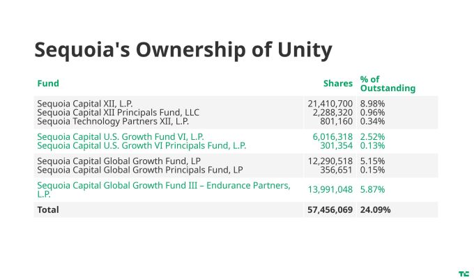 Lo interesante de la participación de Sequoia es cuánto ha crecido a lo largo de los años desde la inversión inicial de la Serie A de la empresa en Unity hace más de una década en 2009. Eche un vistazo a esta tabla de todas las inversiones de Sequoia de sus diversos fondos a lo largo de los años. :