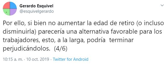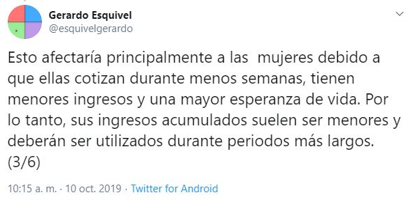 A través de una serie de tuits, Esquivel señaló que todo parte de la situación económica, fiscal y demográfica de México y que no elevar la cantidad de años para poder jubilarse, afectaría, principalmente a las mujeres, pues son quienes cotizan durante menos semanas, tienen menores ingresos y una mayor esperanza de vida.