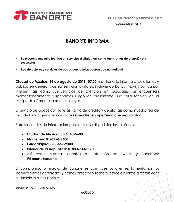 “El compromiso primordial de Banorte es con nuestros clientes; lamentamos los inconvenientes generados y hemos enfocado todos nuestros esfuerzos a restablecer el servicio lo antes posible”, señaló la institución en un comunicado.