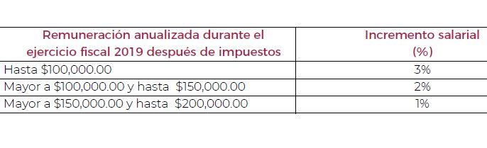 Los empleados que ganen hasta 100 mil pesos anuales tendrán un aumento salarial del 3 por ciento; los que ganen más de 100 mil y menos de 150 mil pesos anuales tendrán un incremento del 2 por ciento, y los que ganen más de 150 mil y menos de 200 mil verán reflejado un aumento del 1 por ciento en su remuneración.