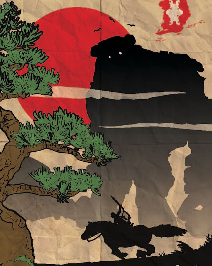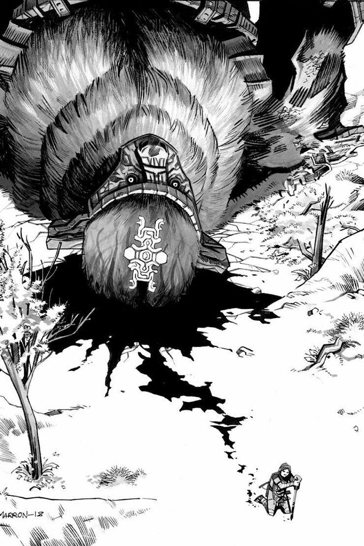 Reimaginado con un telón de fondo japonés, chris wykes ha convertido la vista desolada y saturada de la Tierra Prohibida en algo que se ve más típicamente en los videojuegos. El arte es hermoso, con el gran rojo. Apocalipsis ahora-como un sol que contrasta con el primer coloso al que se enfrenta Wander y el bonsái que enmarca perfectamente la imagen.