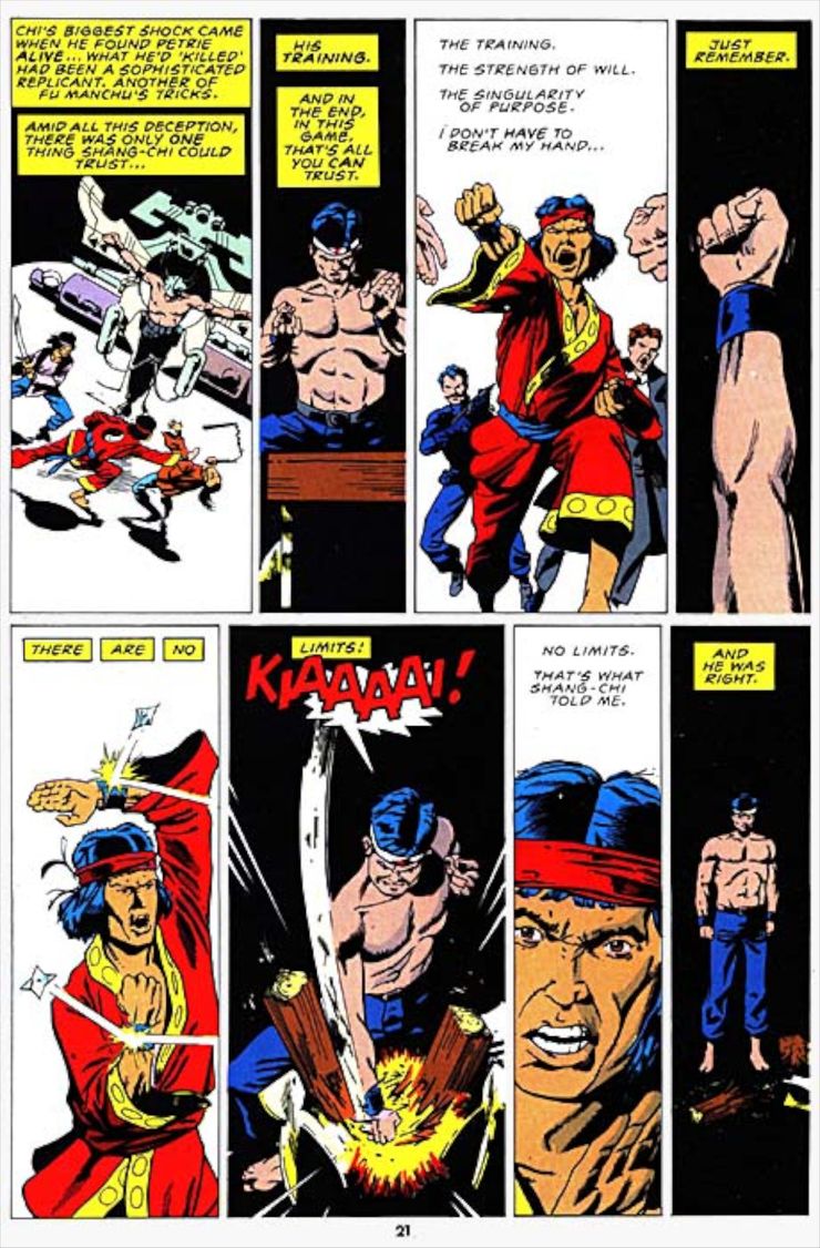 Cuando se lleva al extranjero, el clásico GI Joe: DIRECCIÓN toyline fue renombrada como la línea de sonido más internacional Fuerza de acciónque pronto obtuvo su propia serie de cómics del brazo editorial de Marvel en el Reino Unido. Fuerza de acción El #17 presenta la historia de cinco páginas titulada “Meditaciones en rojo”. Escrita por un joven Grant Morrison y con el arte de Steve Yeowell, la historia detalla cómo el miembro Quick Kick fue entrenado por Shang-Chi. Mientras Quick Kick intenta romper un tronco de madera con el puño, recuerda lo que Shang-Chi le dijo acerca de confiar en su entrenamiento y también recapitula los orígenes del héroe de Marvel desde Maestro de Kung Fu. No hay mucho en la historia, con el corto de cinco páginas actuando básicamente como introducción para una serie de MOKF reimpresiones en próximos números. Todavía es un corto interesante, con Quick Kick también haciendo referencia a los personajes de Marvel Elektra, Iron Fist y Batroc por su nombre al enumerar luchadores famosos en la tradición de Marvel Comics. Esta pequeña historia también sigue siendo el único cruce hasta la fecha entre el mundo de GI Joe y el Universo Marvel, lo cual es sorprendente dado que Marvel publicó el GI Joe cómic durante tanto tiempo.