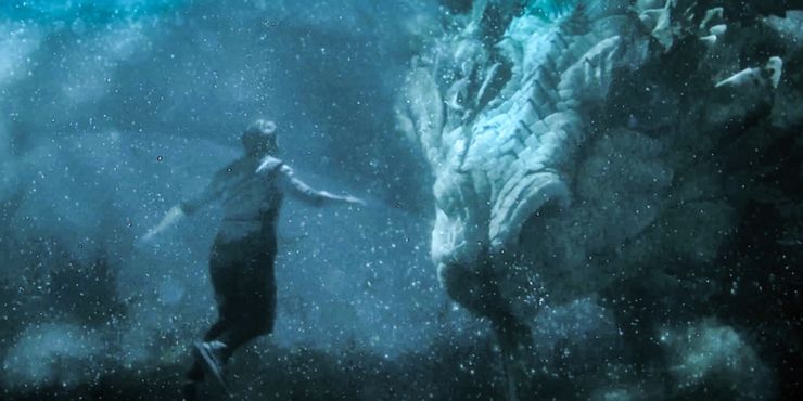 En comparación, Shang-Chi ve al personaje principal, interpretado por Simu Liu, visitando la antigua aldea interdimensional conocida como Ta Lo, que es donde aprende sobre el pasado de su madre mientras espera que su padre Wenwu (Tony Leung Chiu-wai) ataque con sus fuerzas. Además, se reiteran las palabras de su madre de su infancia de que él es el Corazón del Dragón de Ta Lo, un guerrero que tiene el mismo espíritu que el poderoso dragón de la aldea conocido como el Gran Protector. Como tal, cuando Shang-Chi es aparentemente derrotado por su padre, se encuentra cara a cara con el Gran Protector en las aguas del lago Ta Lo. El dragón luego ayuda a Shang-Chi y lucha a su lado, mejorando los orígenes de Puño de Hierro en una espectacular batalla de guerreros y dragones donde el nuevo héroe de la MCU está metafóricamente en posesión del corazón de un dragón, en lugar de destruirlo físicamente para convertirse en el Corazón del Dragón.