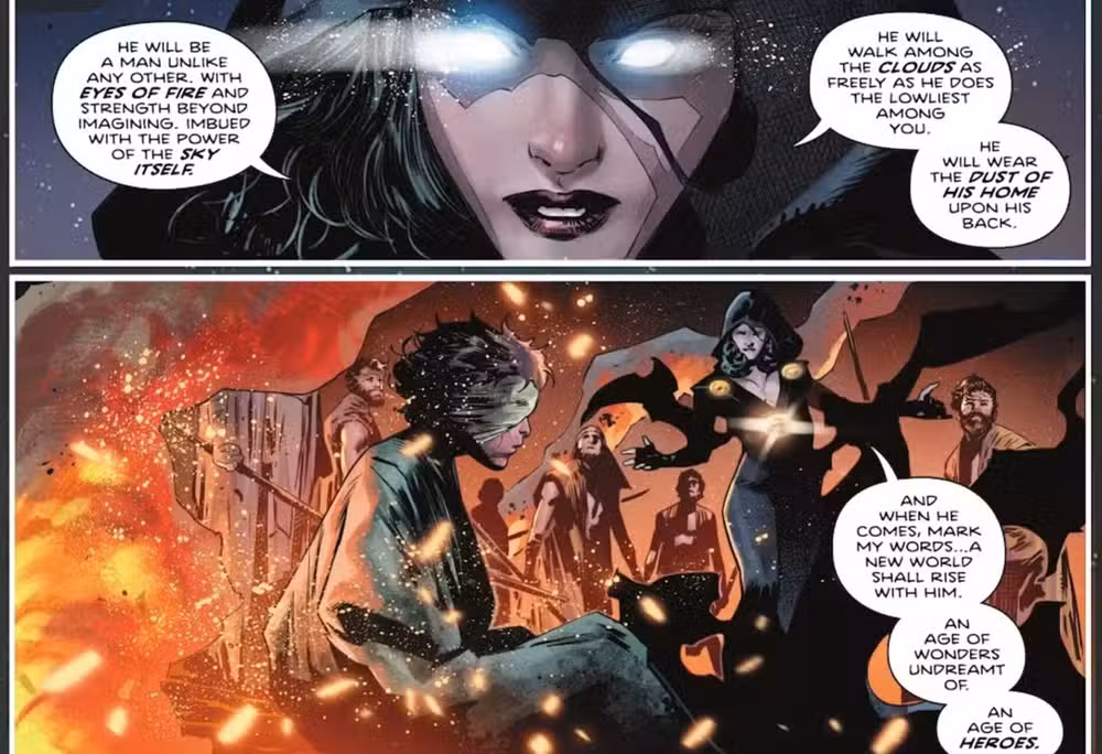 Lo fascinante de esta reinvención es cómo se presenta al rey Shazam como un pretendiente al papel de Superman. La profecía predice “un hombre como ningún otro. Con ojos de fuego y una fuerza más allá de lo imaginable… Llevará el polvo de su hogar sobre su espalda”.
