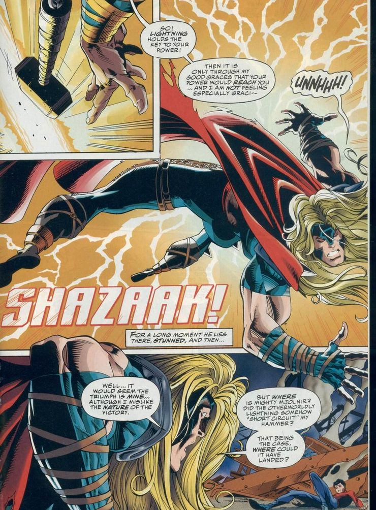 Aunque Billy Batson dijo la palabra mágica, Thor lanza su martillo Mjolnir en el camino del rayo que el Dios del Trueno elige no otorgar a su oponente. En una explosión que derriba tanto a Thor como a Batson, parece que Thor ha ganado ya que Billy no tiene el poder para continuar su lucha. Aunque cuesta temporalmente Thor el uso de Mjolnir, DC vs Marvel vio su primera victoria como Shazam aprendí quién es el verdadero dios del rayo.