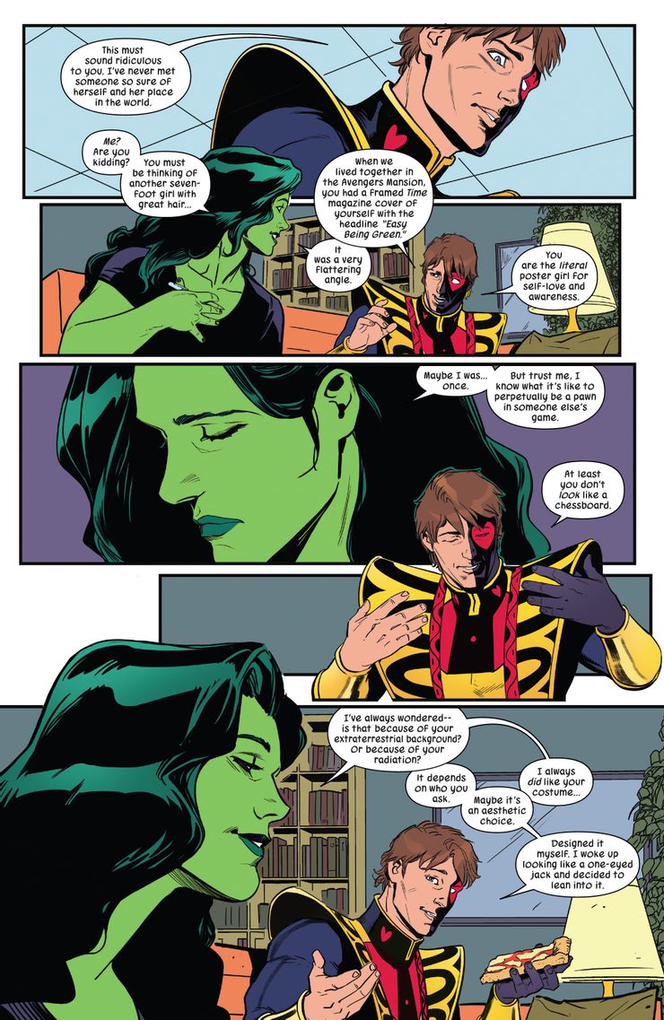 En Ella-Hulk # 3, Jennifer le dice a Jack cuánto ha cambiado. El número está escrito por Rainbow Rowell, ilustrado por Roge Antonio, coloreado por Rico Renzi y rotulado por Joe Caramagna. She-Hulk está permitiendo que Jack de Corazones resucitado se estrelle en su casa. Ella le trae pizza, tratando de que coma. Jack of Hearts se muestra reacio y dice que probablemente debería irse. Ella logra que él hable sobre su pasado y, durante la conversación, él llama a She-Hulk “chica de cartel literal para el amor propio y la conciencia “. Ella lo ignora, diciendo “tal vez lo fui una vez”, antes de decir que ella, como Jack, sabía lo que era ser un “peón en el juego de otra persona”. Aunque probablemente se trate de eventos cómicos recientes, es difícil no verlo como una referencia a la conciencia de She-Hulk de estar en un cómic.