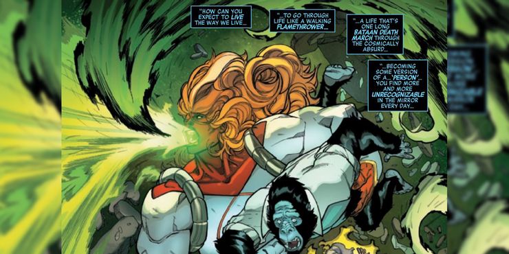 En Vengadores # 48 por Jason Aaron, Javier Garron, David Curiel y Cory Petit de VC, Gorilla-Man ahoga sus penas en un bar en Bagalia, una nación dirigida enteramente por supervillanos. Sin embargo, después de comenzar una pelea en un bar, Winter Hulk lo interrumpe rápidamente, quien rápidamente agarra al ex aliado de los Vengadores. Pero, cuando ella está a punto de irse con él, un grupo de villanos enojados con él le dice que Gorilla-Man está ahí para sacar. She-Hulk no toma amablemente su interferencia y deja escapar una ráfaga de fuego de su boca.