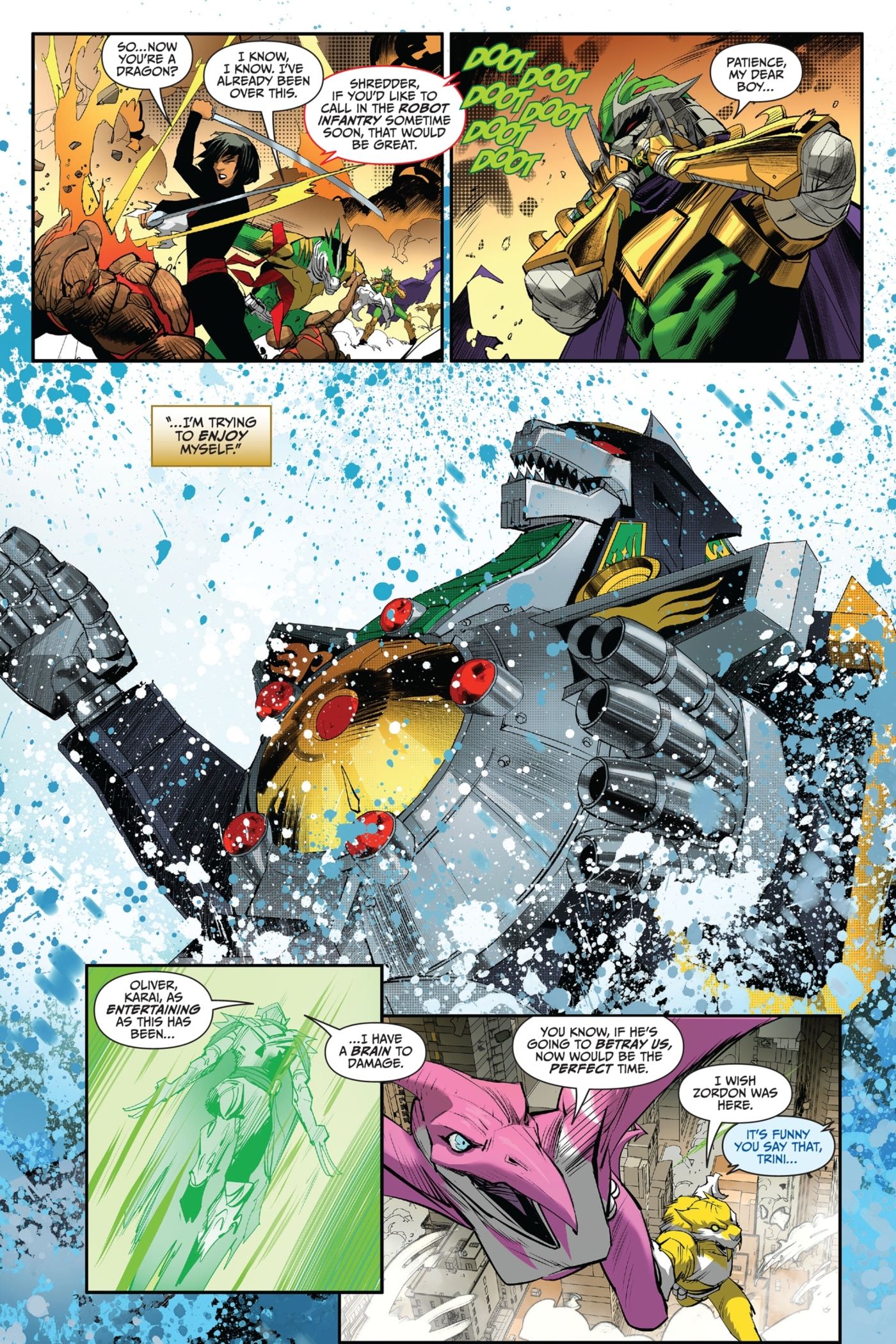 En Mighty Morphin Power Rangers/Teenage Mutant Ninja Turtles II #5 por Ryan Parrott y Dan Mora, la batalla final ha comenzado entre los dos lados opuestos de Rita y Krang contra las Tortugas Ninja y los Power Rangers. Sin embargo, lo que es interesante es que, en este punto del crossover, los Power Rangers y las Tortugas Ninja han cambiado efectivamente sus poderes. Las Tortugas han aprovechado el poder de Morphin Grid de Dimension X, por lo que cada uno de ellos se ha convertido en un nuevo tipo de Power Ranger, Ranger X. Mientras tanto, los Power Rangers perdieron su conexión con el Morphin Grid original, por lo que usaron la energía que les quedaba. en sus morphers se mezclaron con la ciencia interdimensional del exudado mutágeno y se mutaron en los Mighty Mutant Power Rangers. Con los Rangers y las Tortugas intercambiando habilidades, era natural que Shredder se uniera y desbloqueara su propia forma de Power Rangers. Entonces, tal como lo hizo en el primer crossover, Shredder tomó el morpher de Tommy Oliver y se convirtió en el Green Ranger.