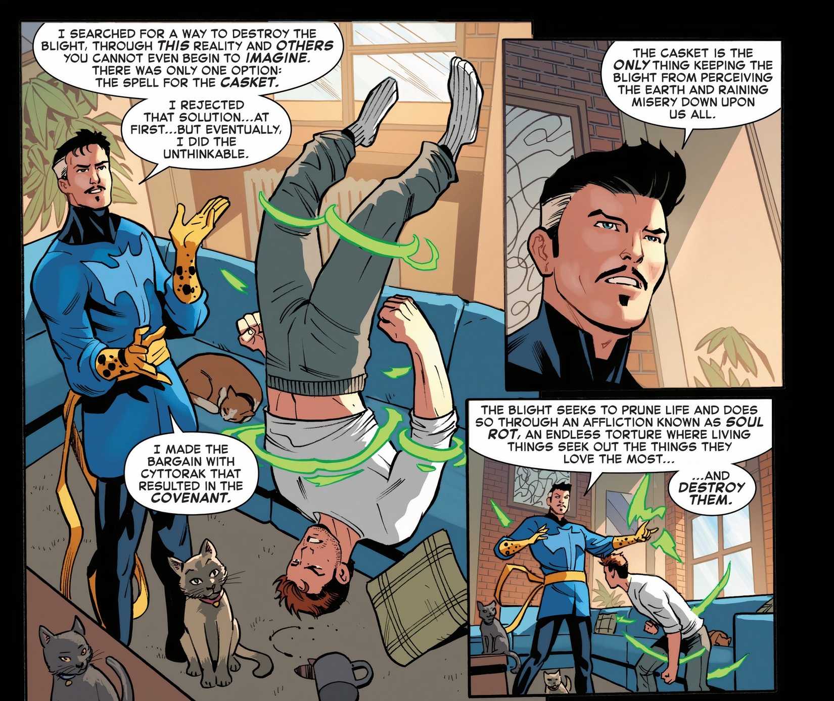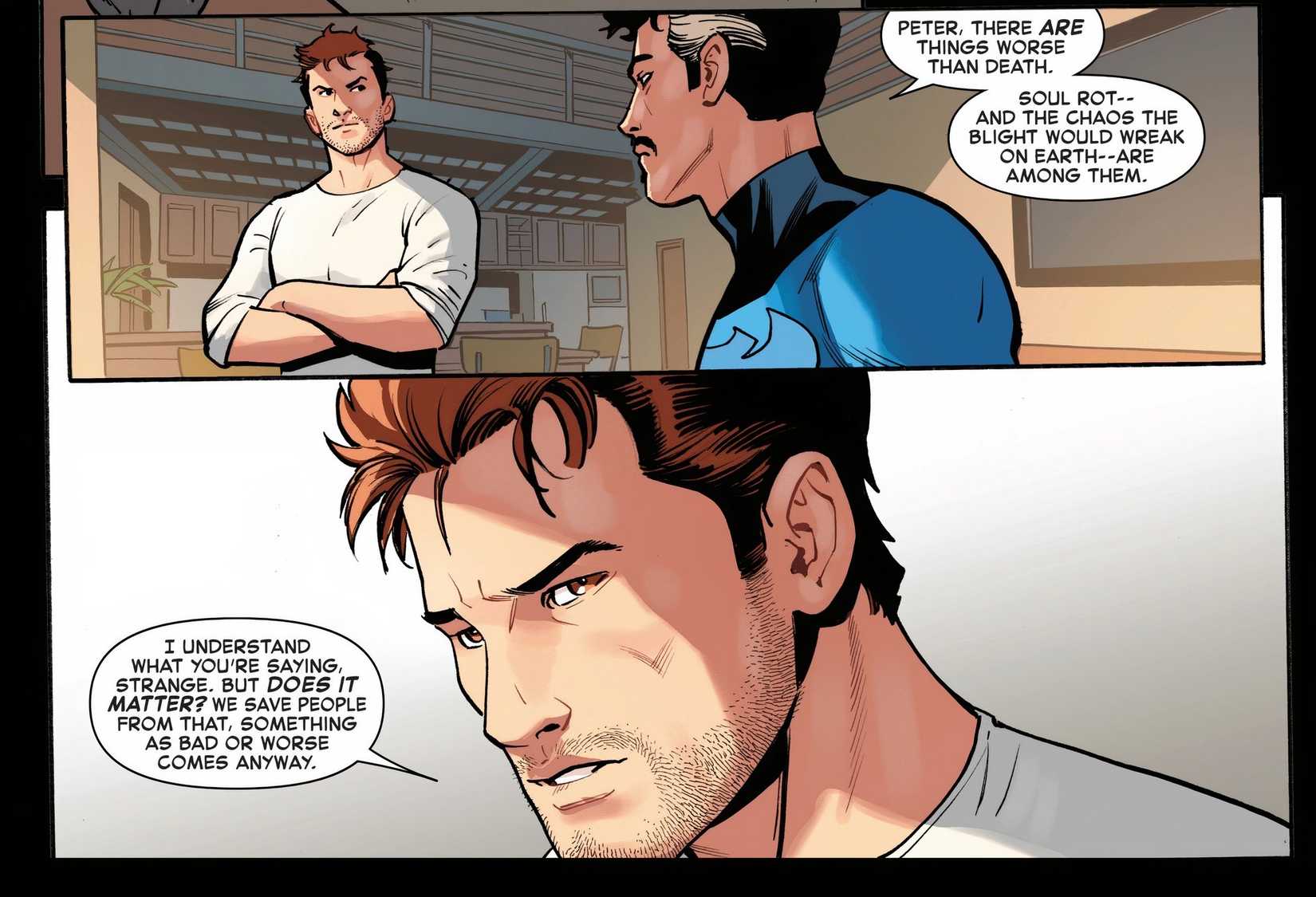 Strange revela que su pacto con Cyttorak estaba destinado a detener el tizón de invadir la tierra. Si el tizón es liberado, conducirá a una aflicción llamada ‘podredumbre del alma’, que hace que las personas busquen y destruyan lo que aman. Desafortunadamente, las palabras del Doctor Strange caen sobre orejas sordas cuando Peter rechazó a su aliado.