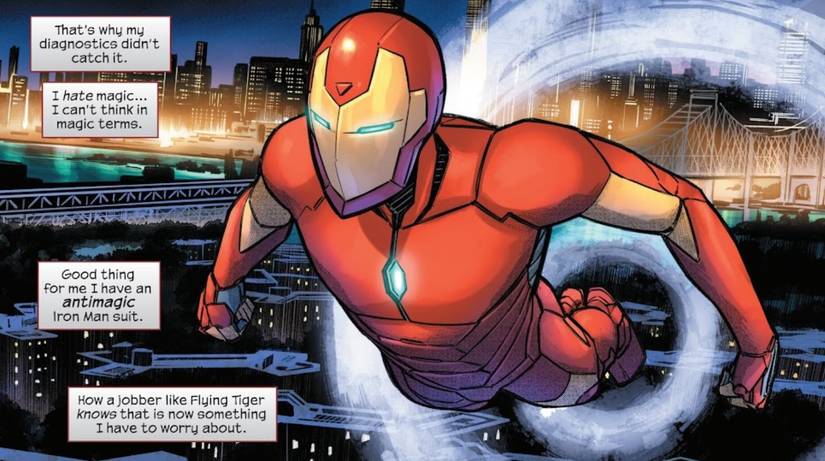 En Hombre de Hierro #1las armaduras de Tony comenzaron a fallar, dañadas por una amenaza desconocida. Iron Man rápidamente descubrió que estaba bajo un ataque mágico, pero lamentablemente no posee la experiencia para defenderse. Iron Man ahora se queda sin todo sus armaduras pasadas, incluido el ultrapoderoso Traje Mysterium que representó su mayor mejora en años. En cambio, se las arregla con el traje Steampunk Improvisado de Iron Man: un trabajo constante en progreso que se mejorará y actualizará a medida que continúe la serie.
