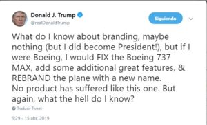 “Qué sé yo sobre el ‘branding’, tal vez nada (¡pero me convertí en presidente!). Pero si fuera Boeing, ARREGLARÍA el Boeing 737 MAX, agregaría algunas funciones adicionales y cambiaría el nombre del avión. Ningún producto ha sufrido como este. Pero, de nuevo, ¿qué diablos sé yo?”, tuiteó.