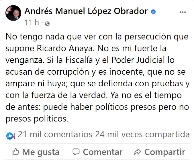 “No tengo nada que ver con la persecución que supone Ricardo Anaya. No es mi fuerte la venganza. Si la Fiscalía y el Poder Judicial lo acusan de corrupción y es inocente, que no se ampare ni huya; que se defienda con pruebas y con la fuerza de la verdad. Ya no es el tiempo de antes: puede haber políticos presos pero no presos políticos”, dijo el presidente en su mensaje.