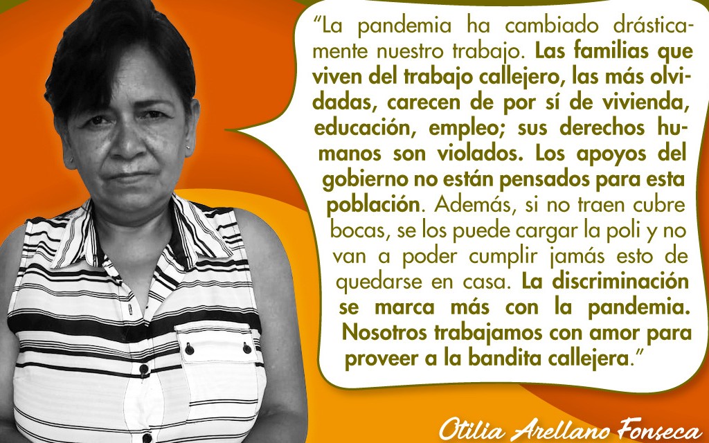 “Las familias que viven del trabajo callejero, las más olvidadas, carecen de por sí de vivienda, educación, empleo; sus derechos humanos son violados. Los apoyos del gobierno no están pensados para esta población. Además, si no traen cubre bocas, se los puede cargar la poli y no van a poder cumplir jamás esto de quedarse en casa. La discriminación se marca más con la pandemia”, asegura Otilia Arellano Fonseca, representante de Amigos Trabajando en los Cruceros.