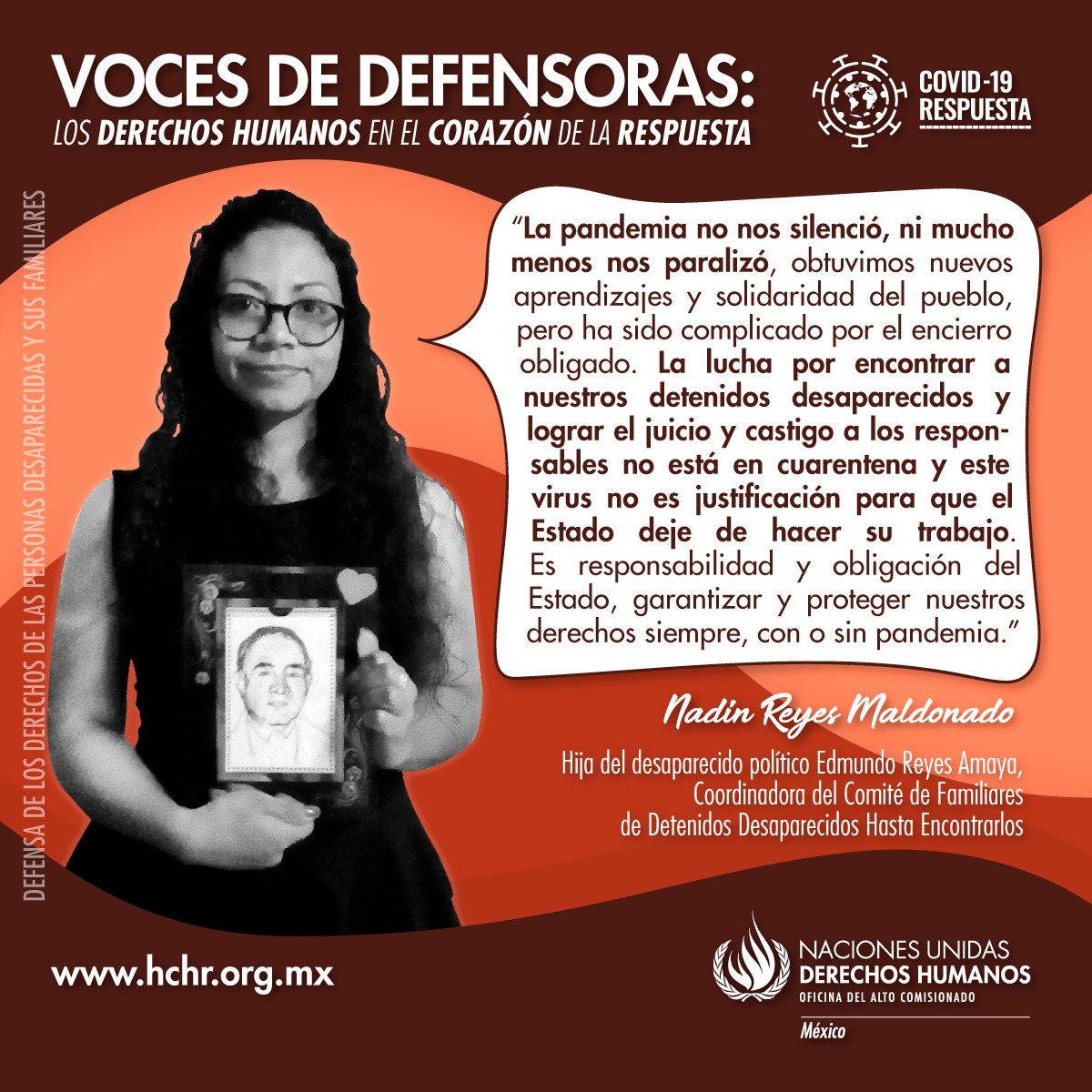 Otro testimonio es el de Nadín Reyes Maldonado, hija del desaparecido político Edmundo Reyes Amaya, quien afirma que la pandemia no los silenció ni paralizó, pues la lucha por encontrar a los suyos continúa: