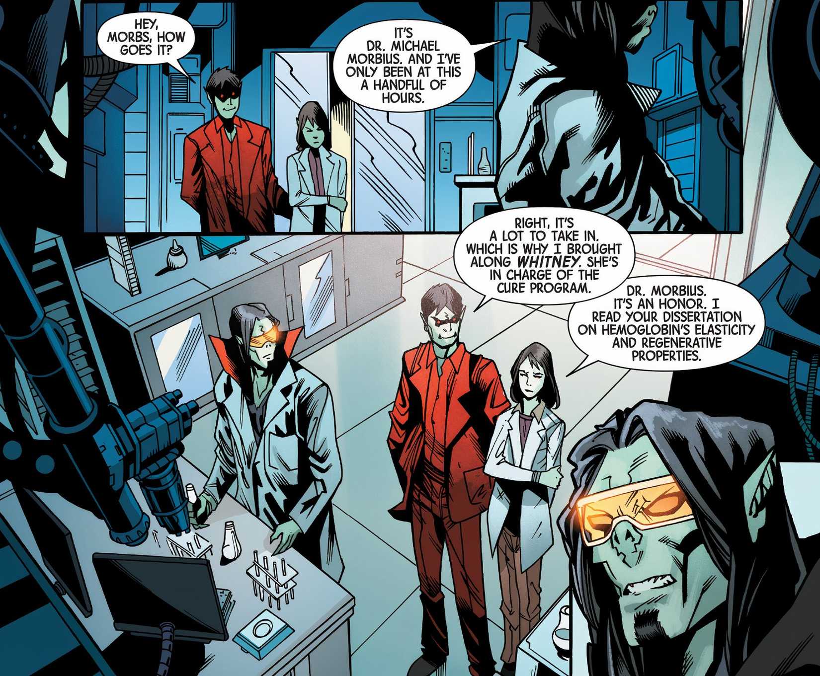 Mientras continúa la toma de posesión vampírica del Universo Marvel en El asombroso Hombre Araña: Caza de sangre #2, el “vampiro viviente” Michael Morbius se encuentra en una posición única. Un ex asociado de Beyond Corporation (y ahora vampiro), TJ, le ofrece un puesto en Hemoglobin Inc., una nueva startup dedicada a estudiar la condición del vampirismo. Cuando Morbius finalmente acepta la oferta, TJ no puede contener su emoción.
