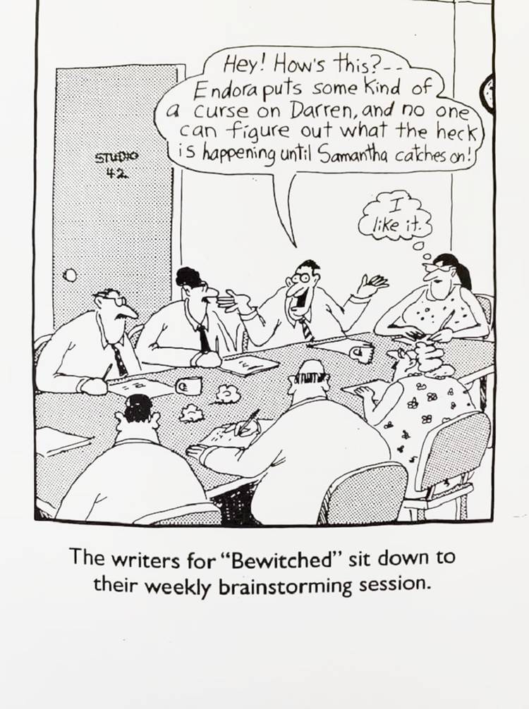A pesar de la naturaleza atemporal de la mayoría Lado lejano Las tiras, incluso Larson no podía evitar usar ocasionalmente la cultura pop para ayudarlo a crear una mordaza. En este consejo particular de la gorra a Hollywood, muestra una habitación de escritores para el espectáculo Embrujadoy un escritor está describiendo con entusiasmo una trama para un episodio (Una fórmula en eso), mientras que uno de los escritores señala internamente que le gusta la idea del episodio.