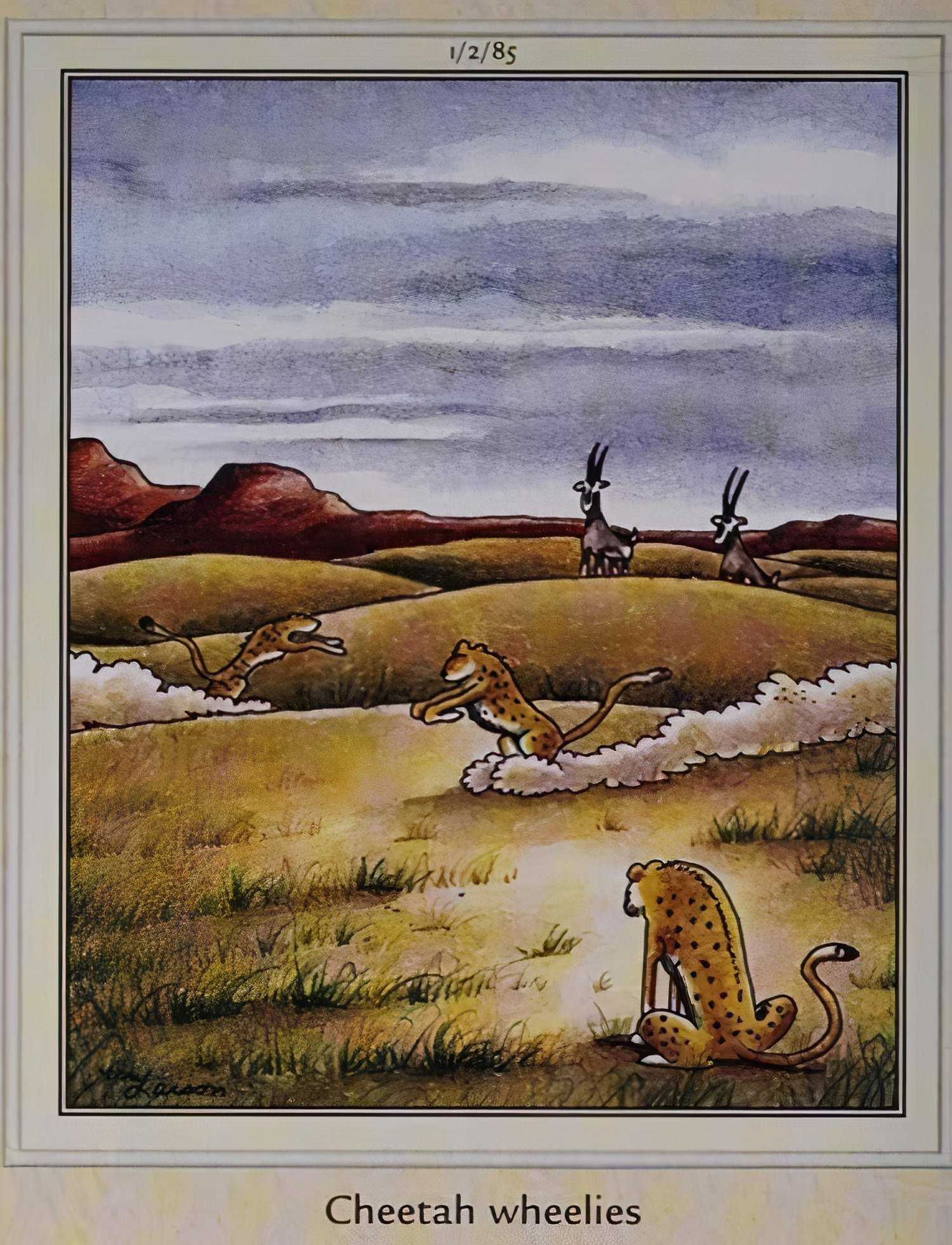 El lado lejano generalmente puede decir mucho sin decir mucho. En esta franja, Larson lleva a los lectores a una llanura donde un par de antílope están viendo una coalición de guepardos. Pero en lugar de los guepardos que intentan perseguir el antílope, todos están pasando el mejor momento de sus vidas, corriendo y estallando ‘ruedas’. La cuestión es que ninguno de ellos está montando motocicletas, por lo que sus ruedas son solo ellos corriendo sobre sus patas traseras con las delanteras en el aire.