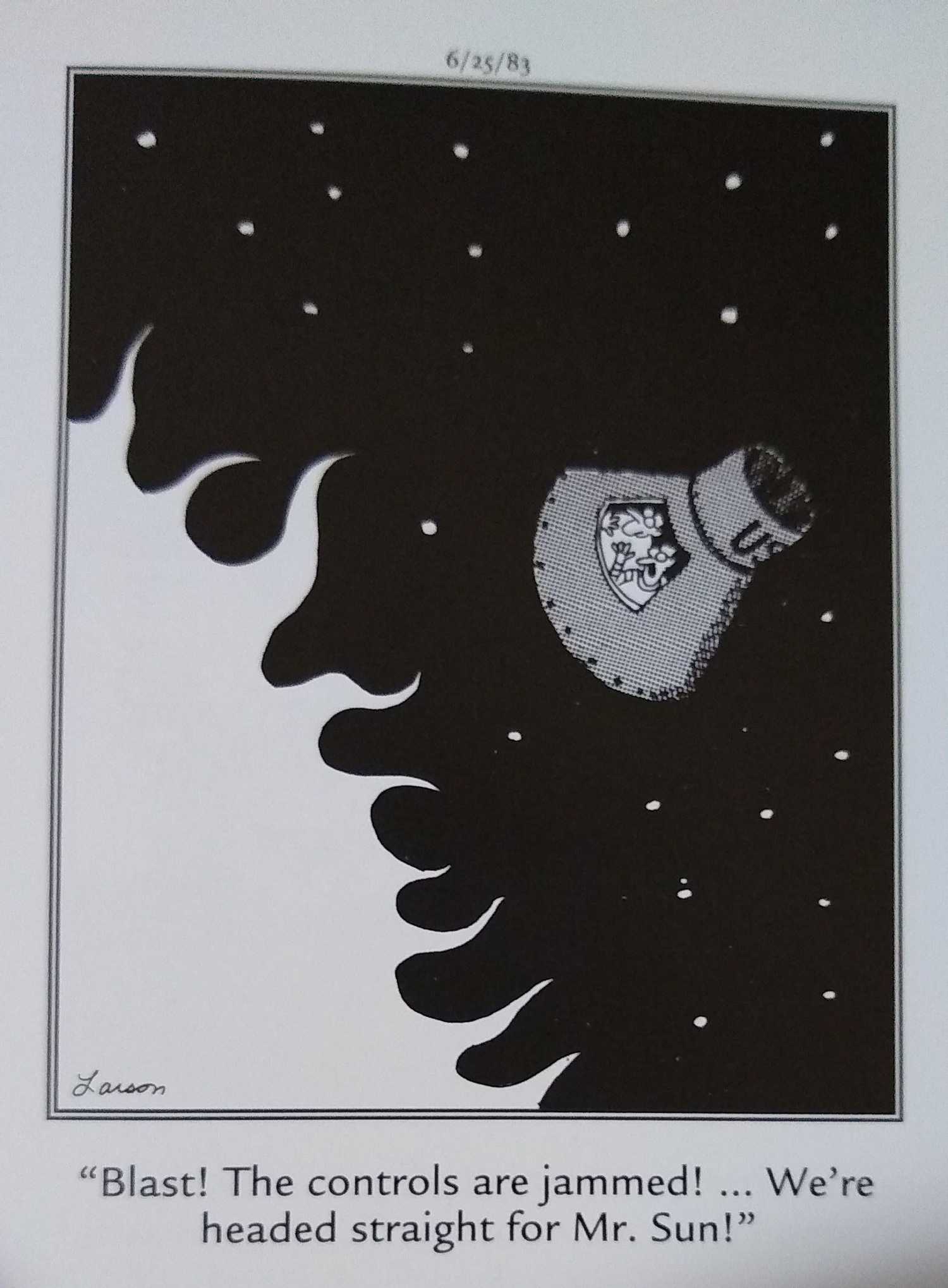 Uno de los aspectos más divertidos de El lado lejano ver a los científicos u otros profesionales académicos comportarse De manera que las personas no imaginen que actúen. Para esta franja, Larson tiene dos astronautas en el espacio y en problemas profundos. Su cápsula está muy lejos del curso y uno de los astronautas destaca la gravedad de su situación. No solo se atascan sus controles, sino que se dirigen directamente hacia el sol o, como el astronauta se refiere a él, ‘Sr. Sol’.